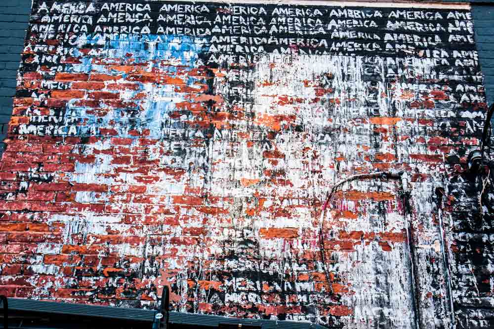 Dieses eindrucksvolle Wandbild ist ein lebendiger Wandteppich aus Worten und Farben, eine kraftvolle Darstellung „Amerikas“ in verschiedenen Zuständen der Klarheit und des Verfalls. Die Wiederholung des Namens, der über die Leinwand geschichtet und ausgebreitet ist, erzeugt ein visuelles Echo, das die Komplexität und Vielschichtigkeit der amerikanischen Identität zum Ausdruck bringt. Das von den Elementen verwitterte Wandgemälde steht als Metapher für die dauerhafte, sich jedoch ständig verändernde Erzählung einer Nation – jede Farbschicht ist eine andere Stimme in der fortlaufenden Geschichte Amerikas. In Toronto gesichtet.